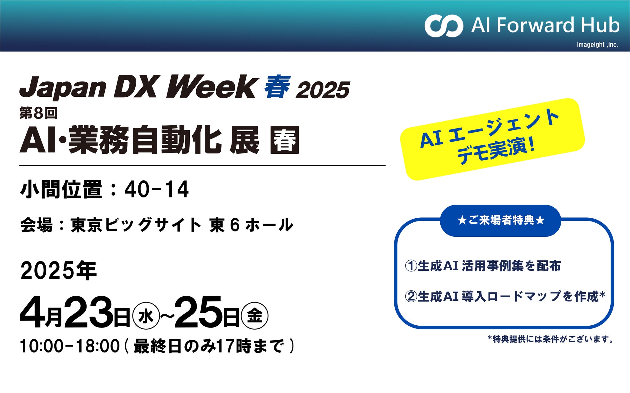 イマジエイト株式会社は、「Japan IT Week 春 2025 第8回 AI・業務自動化展」に「AIフォワードハブ」を出展します。「AIフォワードハブ」は、最新の生成AIモデル(ChatGPT、Claude、Geminiなど)を選択可能な標準チャット機能に加え、RAG(社内データ連携)、個社ごとにオーダーメイド開発が可能なAIアプリを搭載したAIプラットフォームです。AIアプリ(議事録作成、AI-OCR、画像生成など)の操作体験、RAGの活用事例紹介、営業や経理などの業務活用を想定したAIエージェントの実演デモに注目です。