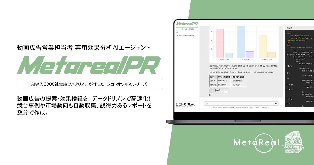 株式会社メタリアルは2025年6月16日、ソーシャルメディア市場分析・投稿戦略レポート作成AIエージェント「Metareal プロモーション」(Metareal PR)の提供を開始しました。この新サービスは、動画配信サイトの広告部や販促課の営業担当者向けに特化し、生成AIを活用して動画広告の戦略立案や効果分析レポートを自動作成するツールです。